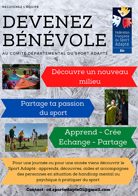 Notre Adresse : Comité Départemental du Sport Adapté 01 2725 Route de Lent 01960 Péronnas | Nous contacter : 06 43 10 30 36 cd.sportadapte01@gmail.com
